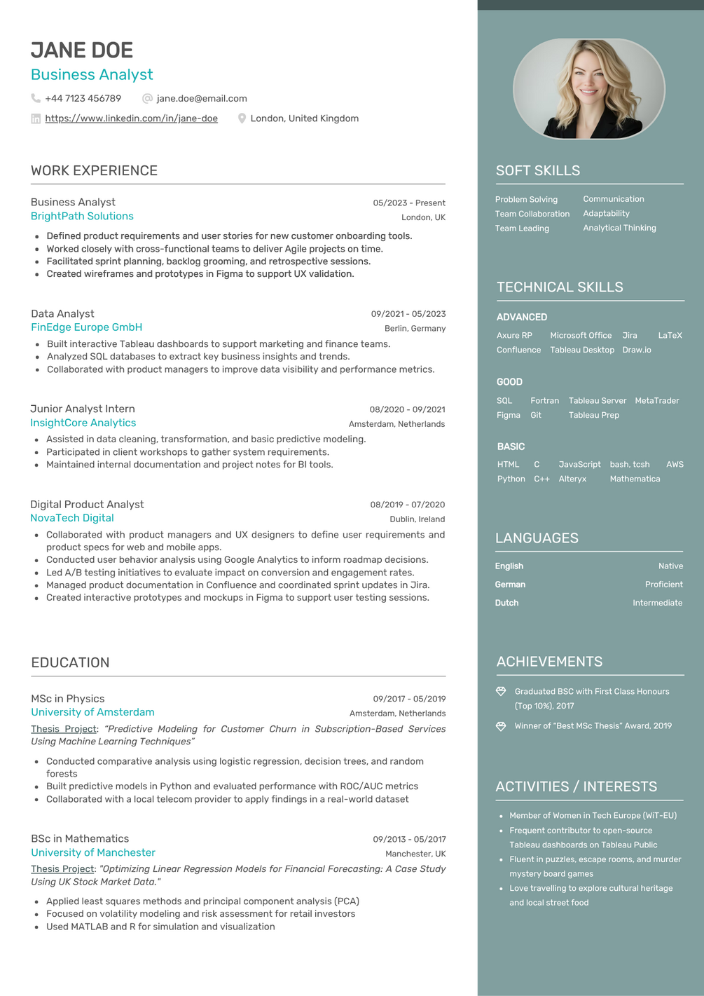 Professional CV template for analysts and tech job seekers. Clean, modern, and fully editable in Canva